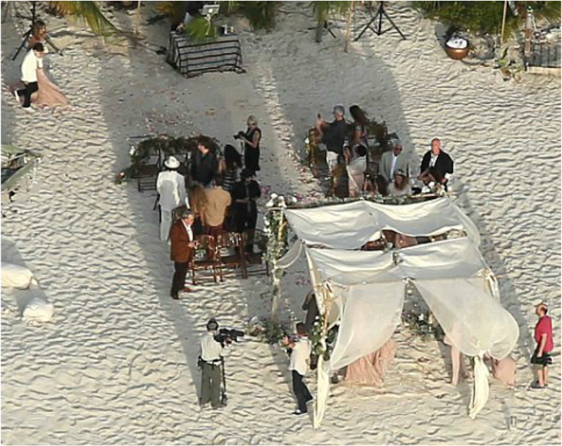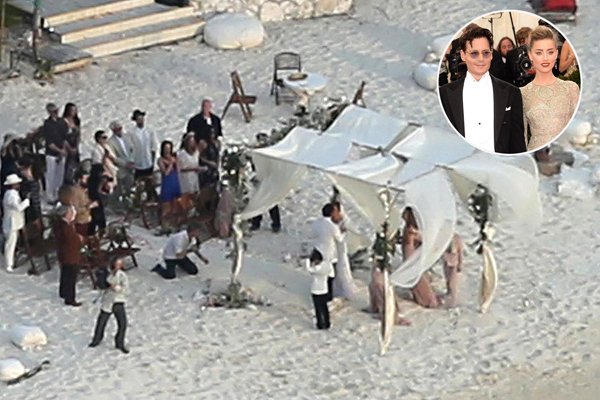 Παρακάτω θα δείτε τις φωτογραφίες από την παραθαλάσσια τελετή στις Μπαχάμες. Η τελετή ήταν λιτή και ρομαντική. Η παραλία είχε διακοσμηθεί με λευκά λουλούδια. Φημολογείται πως το νυφικό της Heard ήταν ειδικά ραμμένο για αυτή από τη Stella McCartney. Από τις αεροφωτογραφίες μπορούμε να καταλάβουμε πως, αν και μικρή, ήταν σίγουρα μια πολυτελής τελετή.